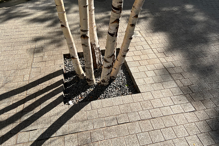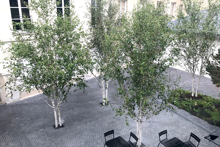 The use of sandstone cobblestones lends to the space its noble and urban character. Oak, plane, and birch trees are interspersed across the mineral surface. The technical constraints are decisive here. An underground parking lot strongly limits the supply of topsoil.