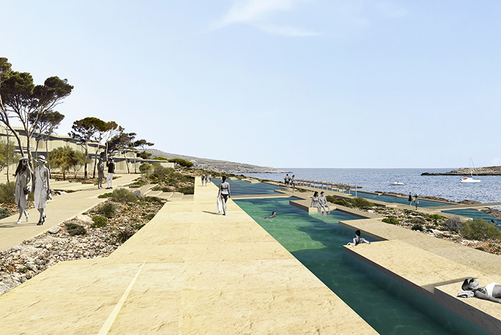 Today the hotel is obsolete and is going to be transformed in a luxury hotel whom architecture will be coherent with the island geology. Leaning against the hill and open to the sea, it will host two swimming pools including a sea level basin inspired by traditional Maltese salt marshes sculpted in the rocks.